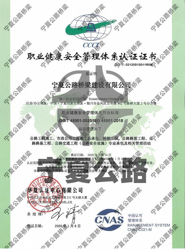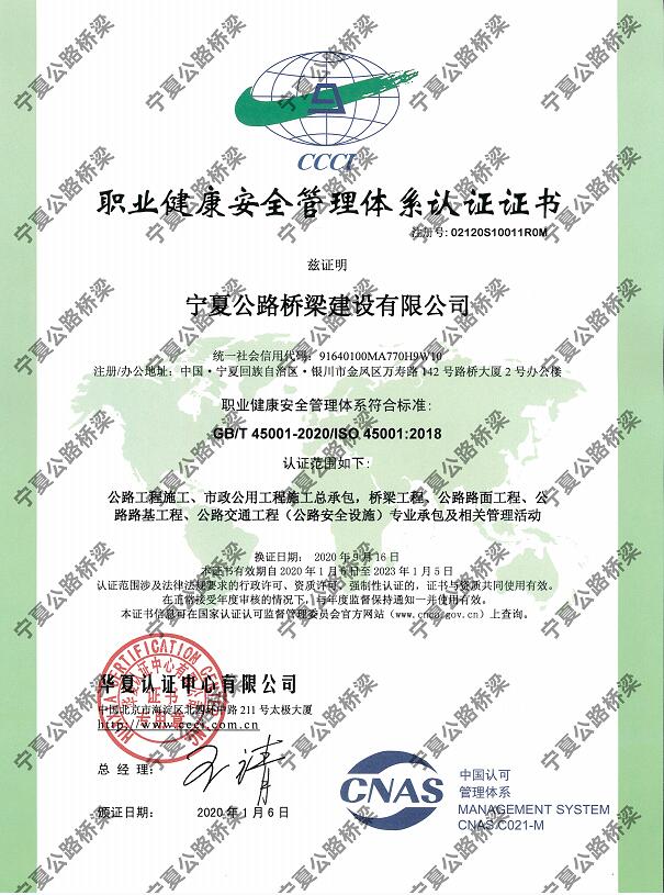 寧夏公路橋梁建設(shè)有限公司職業(yè)健康安全管理體系認(rèn)證證書