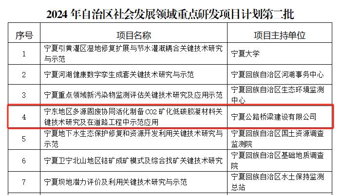 近日,寧夏回族自治區(qū)科學(xué)技術(shù)廳下達(dá)了《2024年社會(huì)發(fā)展領(lǐng)域重點(diǎn)研發(fā)項(xiàng)目第二批計(jì)劃的通知》,由公司主持申報(bào)的《寧東地區(qū)多源固廢協(xié)同活化制備CO2礦化低碳膠凝材料關(guān)鍵技術(shù)研究及在道路工程中示范應(yīng)用》項(xiàng)目經(jīng)過嚴(yán)格評(píng)審與層層篩選,由寧夏回族自治區(qū)科學(xué)技術(shù)廳批準(zhǔn),順利立項(xiàng)。