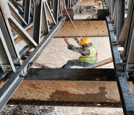 中午11時30分左右,洪水位下降50cm,項目部安排施工人員對鋼便橋下部結(jié)構(gòu)進行了細(xì)致的檢查和維修。12時,小型車輛全部恢復(fù)交通。下午2時35分,洪水位下降1米,項目部采用限時放行、單向通行的方法,在保證小型車輛通行的同時,積極對已經(jīng)水毀的鋼便橋橋臺進行了加固處理,對部分橋面鋼板再次進行了錨固處理。為了減少洪水阻力,項目部在保證人員的安全的前提下,及時清理了鋼便橋橋下雜物。晚7時,大型貨車恢復(fù)交通。