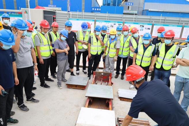 交流團(tuán)隊(duì)在實(shí)體T梁現(xiàn)場,項(xiàng)目總工又結(jié)合樣板展示牌和實(shí)體T梁,將楔形塊的調(diào)整、封錨端的密閉、梁體的防漏漿、鋼絞線的工作長度控制等施工細(xì)節(jié)做了詳細(xì)的分享。