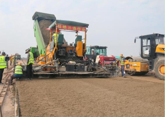 為確保此次水穩(wěn)底基層順利攤鋪,項(xiàng)目部始終堅(jiān)持“技術(shù)檢測先行、管理高度落實(shí)、物料無縫銜接”的方針,通過精心籌劃、周密部署,合理配備人員、機(jī)械,并在施工前組織技術(shù)人員認(rèn)真學(xué)習(xí)施工方案,嚴(yán)格把控原材料質(zhì)量、優(yōu)化配合比、組織機(jī)械作業(yè)等關(guān)鍵環(huán)節(jié)。施工現(xiàn)場各類機(jī)械井然有序,各工序緊密銜接,形成了集運(yùn)輸、攤鋪、碾壓“一體化”水穩(wěn)施工作業(yè)流水線。