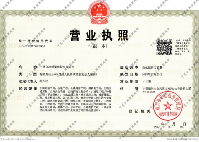 為更好地適應(yīng)市場開發(fā)新形勢,傳承企業(yè)發(fā)展歷史在區(qū)內(nèi)乃至全國公路建設(shè)市場良好的口碑和聲譽,為公司創(chuàng)造有利、順暢的市場開拓優(yōu)勢,公司已將“寧夏中達公路建設(shè)有限公司”更名為“寧夏公路橋梁建設(shè)有限公司”。