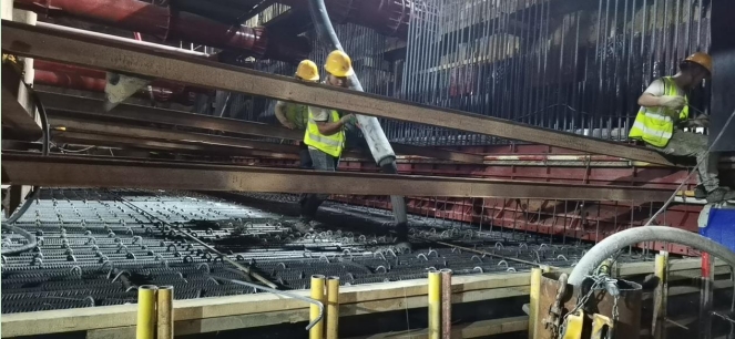 為確保首件底板順利澆筑,項目部做了詳細的部署,嚴格把控鋼筋綁扎、模板安裝等工序,實現(xiàn)技術(shù)、質(zhì)量、安全全過程管控,確保各項工序優(yōu)質(zhì)高效開展;嚴格落實安全、技術(shù)雙交底,從澆筑前中后的3個階段,明確大體積混凝土澆筑、養(yǎng)護、防開裂等各項質(zhì)量控制措施,狠抓全過程質(zhì)量控制;切實執(zhí)行項目班子成員帶班制、重大節(jié)點旁站制,通過提前策劃與動態(tài)管理,對現(xiàn)場人、材、機進行實時監(jiān)測及科學調(diào)度,為安全穩(wěn)定有序施工提供有力保障。