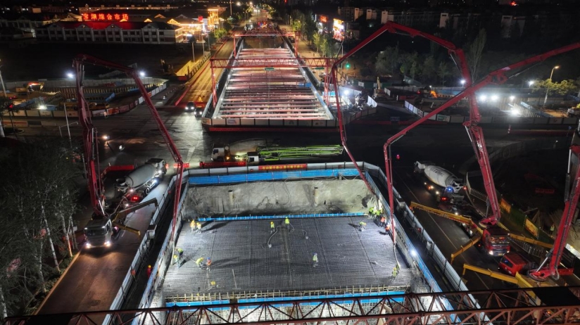 10月13日凌晨,正源街與寶湖路交叉口快速化改造工程第一塊頂板澆筑施工完成。